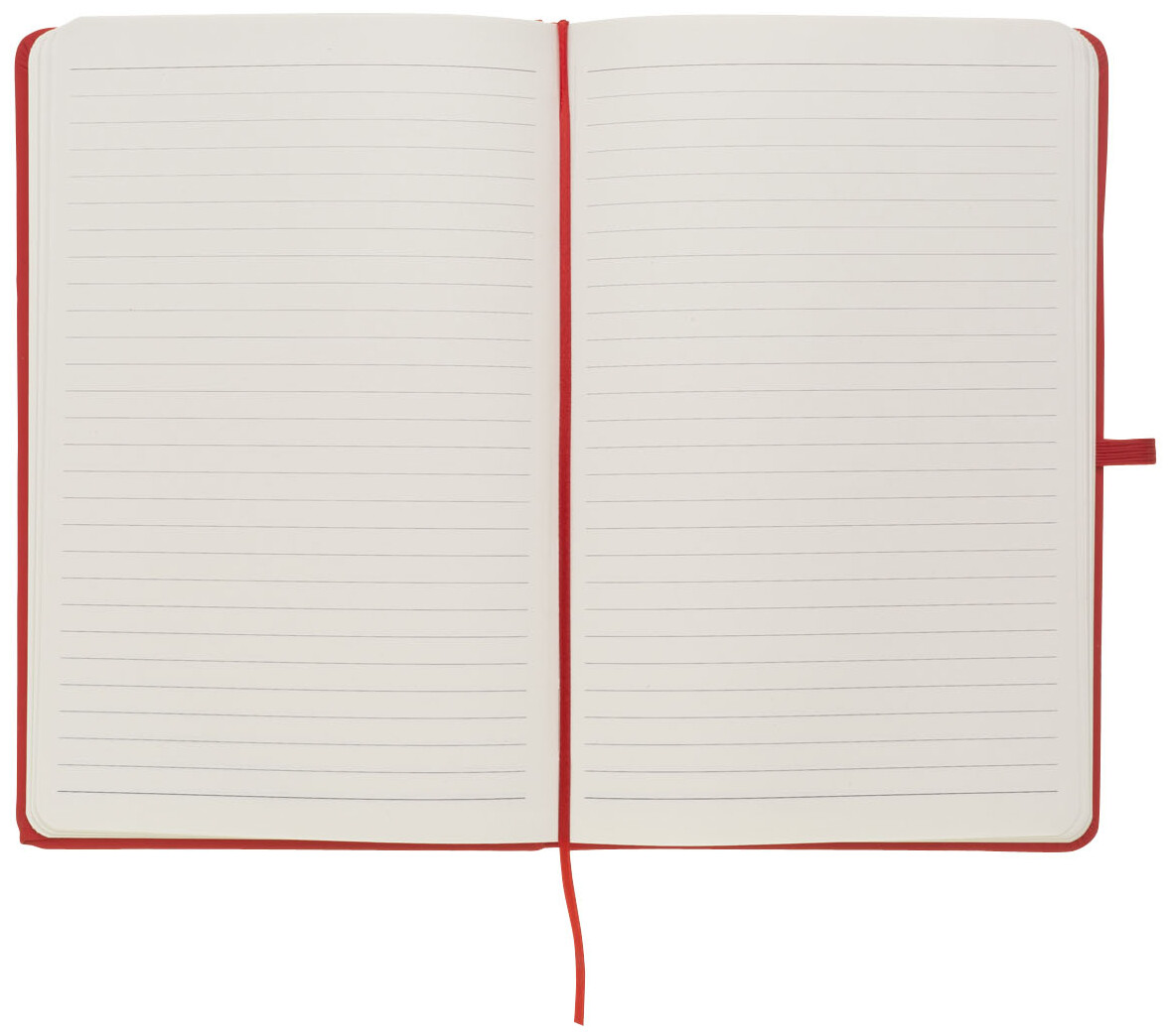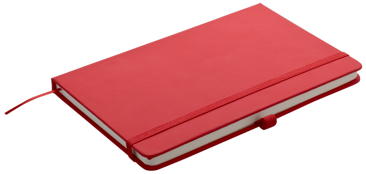 Zápisník A5 v červených deskách z PU materiálu má 80 linkovaných listů. Blok má uzavírací gumičku, poutko na propisku a textilní záložku v barvě desek.