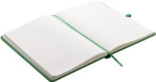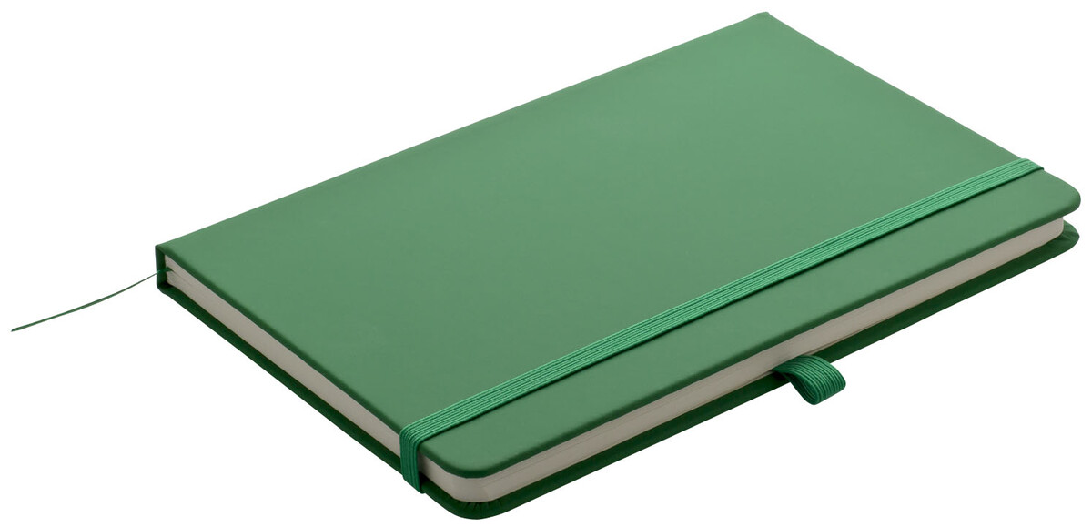 Zápisník A5 v zelených deskách z PU materiálu má 80 linkovaných listů. Blok má uzavírací gumičku, poutko na propisku a textilní záložku v barvě desek.