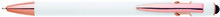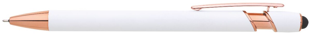 Kovová propiska se soft povrchem, touch koncovkou a doplňky v růžovo-zlaté barvě. Laserované logo je lesklé, růžovo-zlaté. Náplň semigelová, modře píšící.