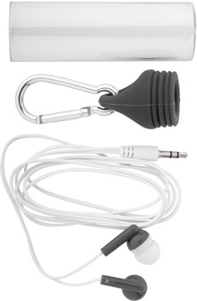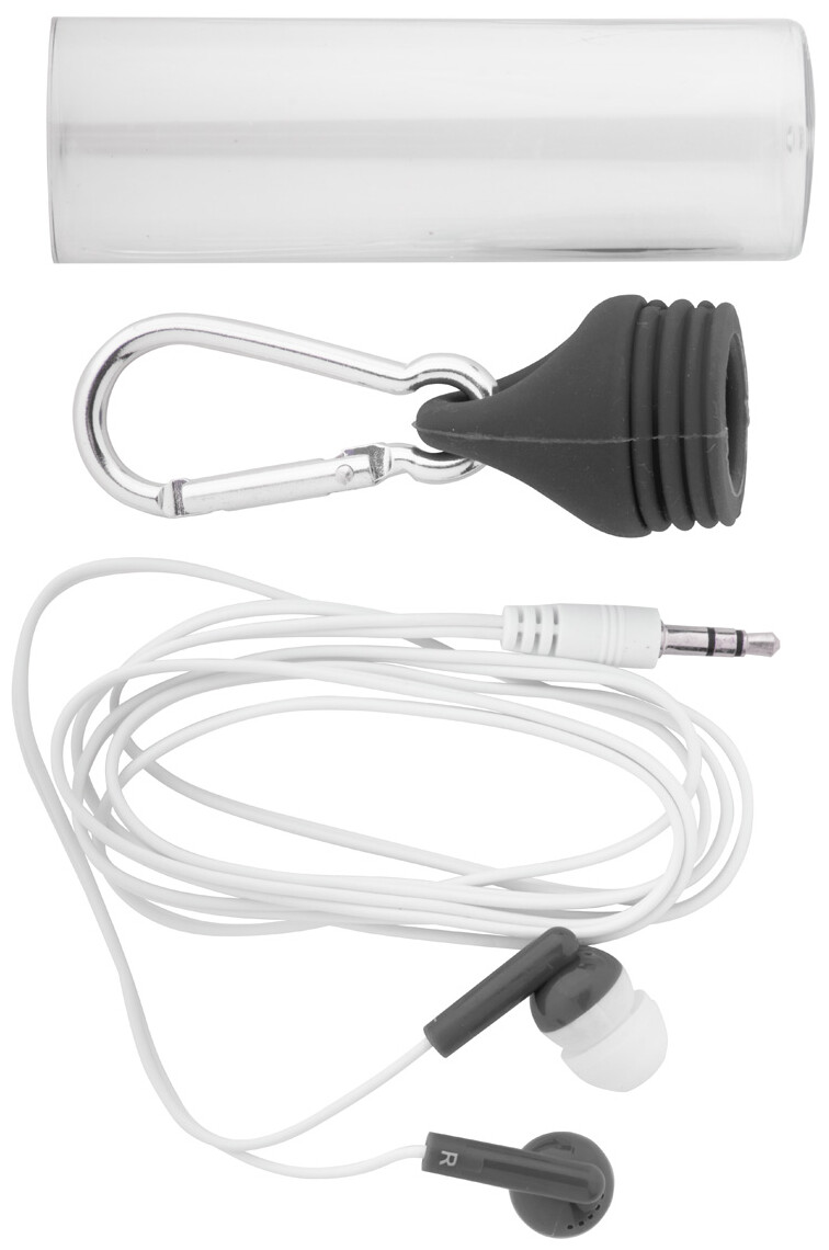 Sluchátka do uší s 3,5 mm audio Jackem, v plastové krabičce s karabinkou a stejně barevným vrškem.