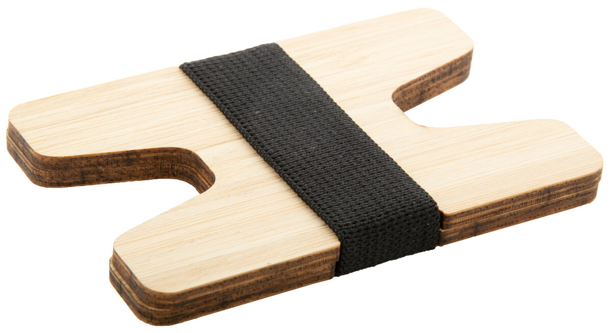 Držák na karty z bambusové překližky s gumovým páskem.