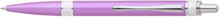 Plastová propiska s metalickým růžovým povrchem a chromovými ozdobnými detaily. Velkoobsahová, modře píšící náplň.