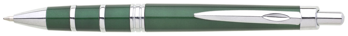 Metalické zelené tělo s chromovými ozdobnými kroužky a chromovými doplňky. Náplň velkoobsahová, modře píšící.