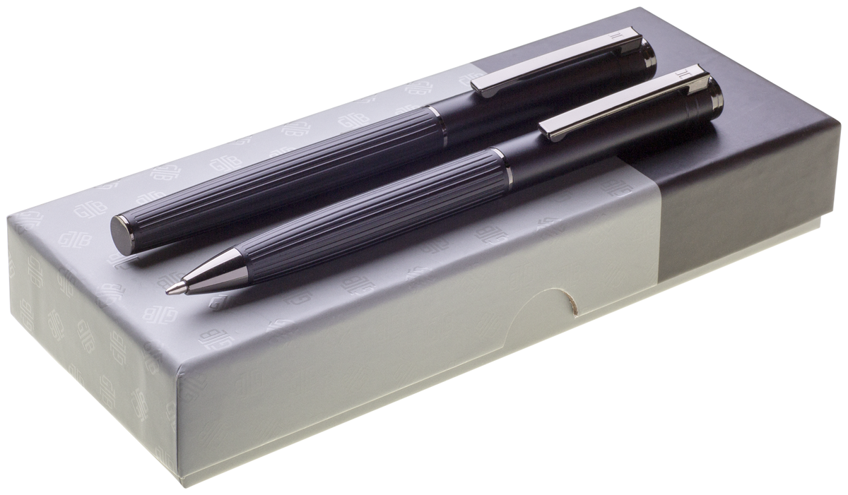 Dárková sada s černou propiskou a rollerem v dárkové papírové krabičce. Laser na propiskách je lesklý stříbrný. Kolekce GB.