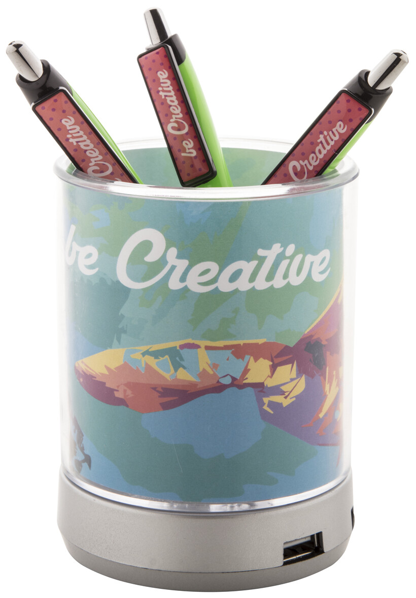 Stojánek na propisky s USB hubem se 4 porty. Tištěnou grafiku lze dát mezi 2 stěny.