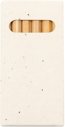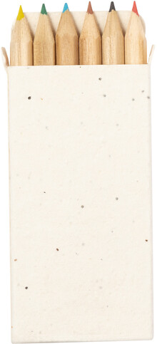 6dílná sada dřevěných barevných tužek v krabičce ze semenného papíru. Papírová krabička obsahuje semena petúnie v různých barvách, která lze po použití zasadit.