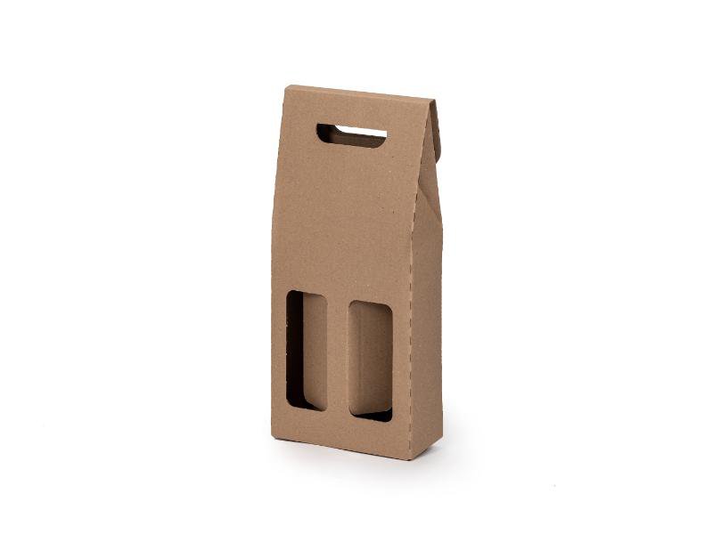 Dárkový odnosný obal z vlnité lepenky se skládaným dnem, díky kterému se lehce skládá, a praktickým odnosným uchem. Průhledová okénka jsou bez folie. Krabice je určena na různé pivní lahve, normováno zejména na obaly 0,75 l + 1 l PET, skleněná lahev 0,75 l a 1 l. Díky absenci potisku je možné využít také jako obal pro jiné nápoje či produkty typu kosmetika nebo drogerie. Obal pojme lahve o maximálním průměru 83 mm a výšce 300 mm. Přírodní - hnědé zabarvení papíru. Dodáváme v rozloženém stavu.