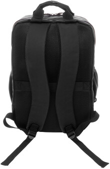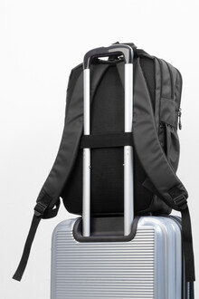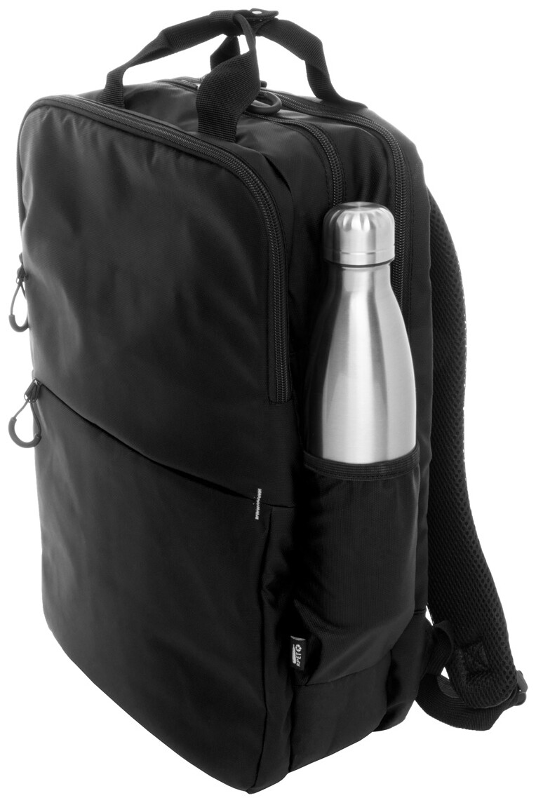 Vodotěsný batoh RPET se 2 přihrádkami na zip, 2 předními kapsami na zip, bočními kapsami a polstrovanou přihrádkou na notebook (16"). S popruhem na vozík, polstrovanými zády a ramenními popruhy. Polyester 600D RPET potažený PU, s výrazným štítkem RPET.
