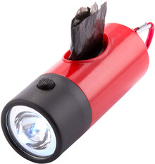 Plastový zásobník na psí odpadky s 1LED světlem, 15ti sáčky a hliníkovou karabinkou, vč. knoflíkových baterií.