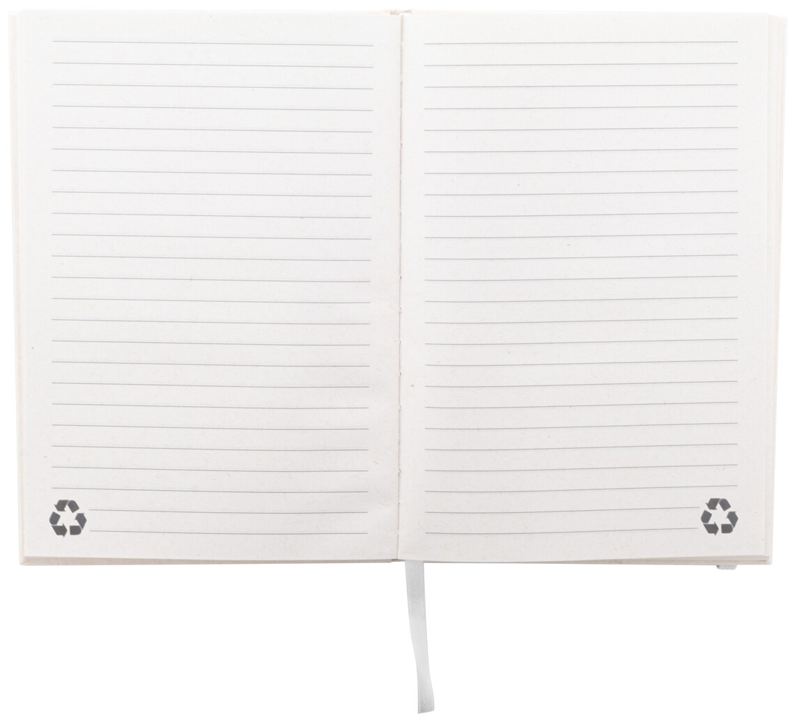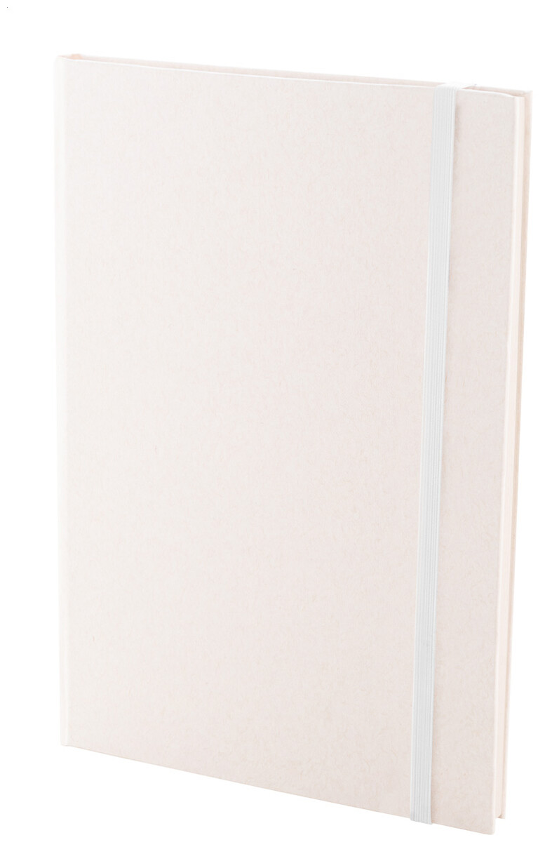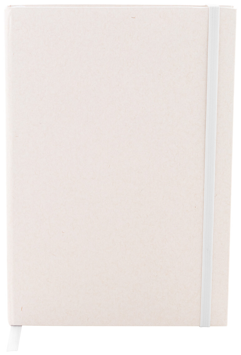 Blok A5 z kartonu z recyklovaného mléka s pevnou vazbou, 80 linkovanými listy a elastickým páskem v odpovídající barvě.