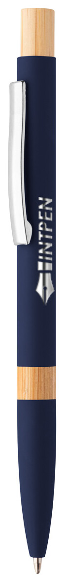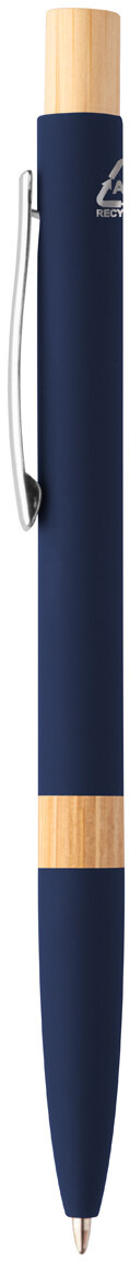 Kuličkové pero z recyklovaného hliníku s bambusovými částmi, pogumovaným povrchem a chromovým klipem. Se speciální vrstvou pro zrcadlové laserové gravírování. S modrou náplní.