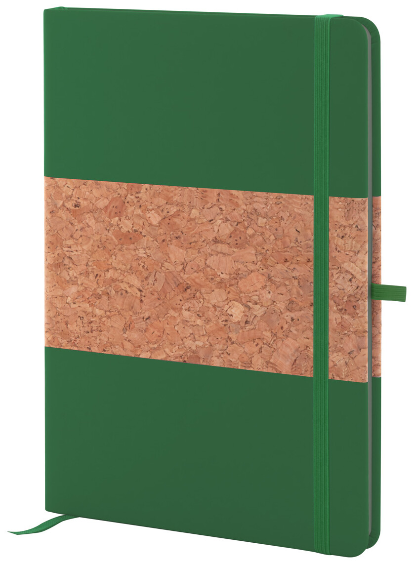 Blok A5 potažený přírodním korkem a recyklovanou PU kůží se záložkou v odpovídající barvě, gumičkou a držákem na pero. S 80 linkovanými listy z recyklovaného papíru.