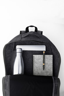 Batoh z RPET plsti s hlavním prostorem na zip a přední kapsou. S přihrádkou na notebook (15"), popruhem na vozík a polstrovanými ramenními popruhy. S výrazným štítkem RPET.