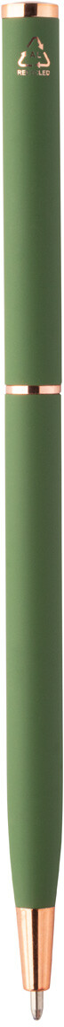 Kuličkové pero z recyklovaného hliníku s pogumovaným povrchem a detaily z růžového zlata. Se speciální povrchovou úpravou pro zrcadlové laserové gravírování v barvě růžového zlata. S modrou náplní.