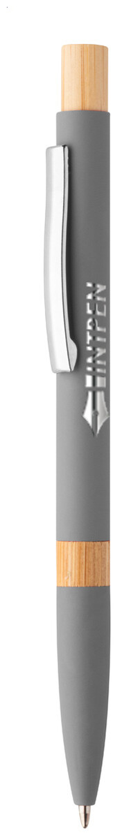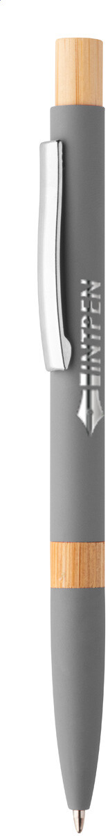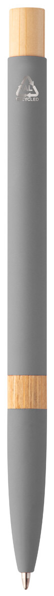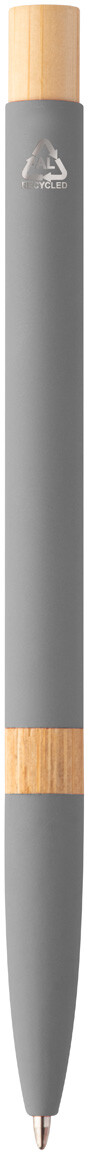 Kuličkové pero z recyklovaného hliníku s bambusovými částmi, pogumovaným povrchem a chromovým klipem. Se speciální vrstvou pro zrcadlové laserové gravírování. S modrou náplní.