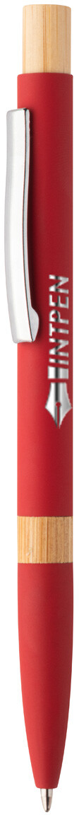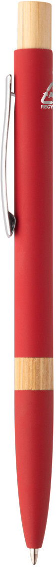 Kuličkové pero z recyklovaného hliníku s bambusovými částmi, pogumovaným povrchem a chromovým klipem. Se speciální vrstvou pro zrcadlové laserové gravírování. S modrou náplní.