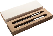 Sada pera z recyklovaného hliníku s kuličkovým perem a mechanickou tužkou s bambusovými knoflíky. S modrou náplní a 0,7 mm tuhy. V kraftové papírové krabici.