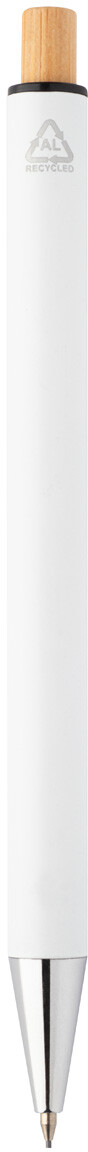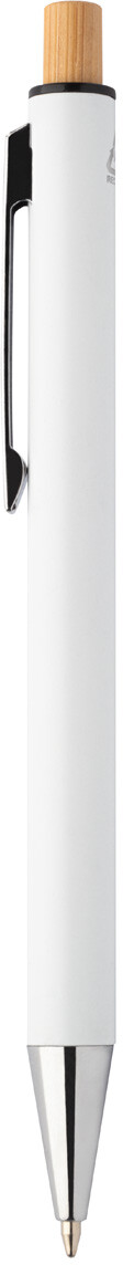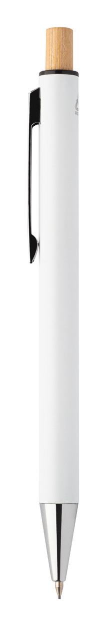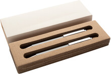 Sada pera z recyklovaného hliníku s kuličkovým perem a mechanickou tužkou s bambusovými knoflíky. S modrou náplní a 0,7 mm tuhy. V kraftové papírové krabici.
