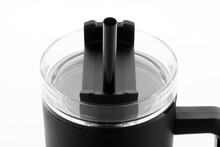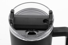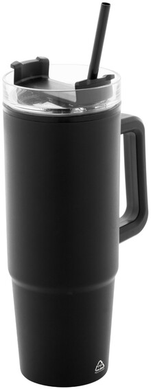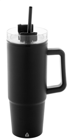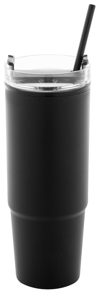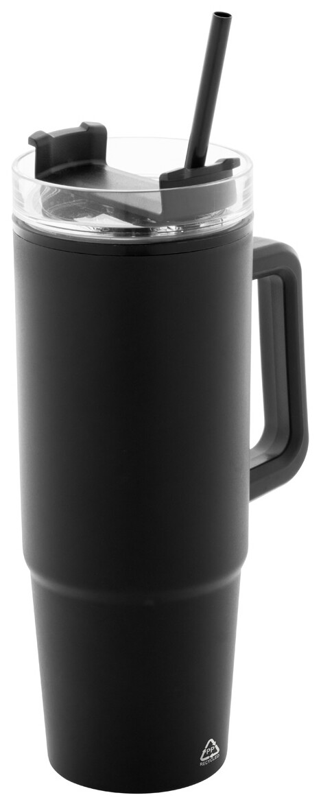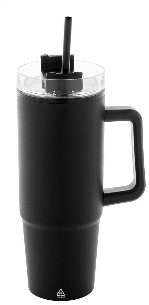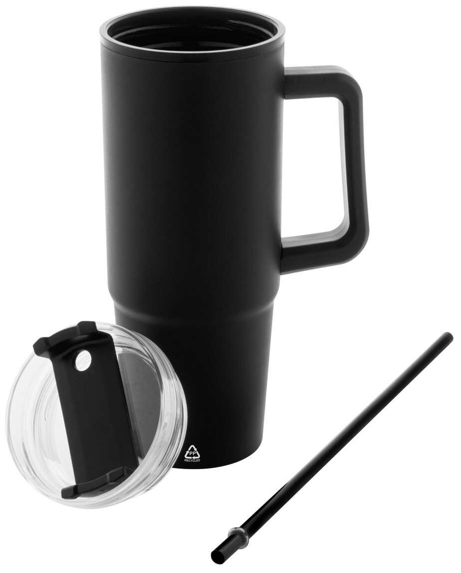 Dvoustěnný termo hrnek z recyklovaného PP plastu s plastovým víčkem na pití a brčkem. 900 ml.