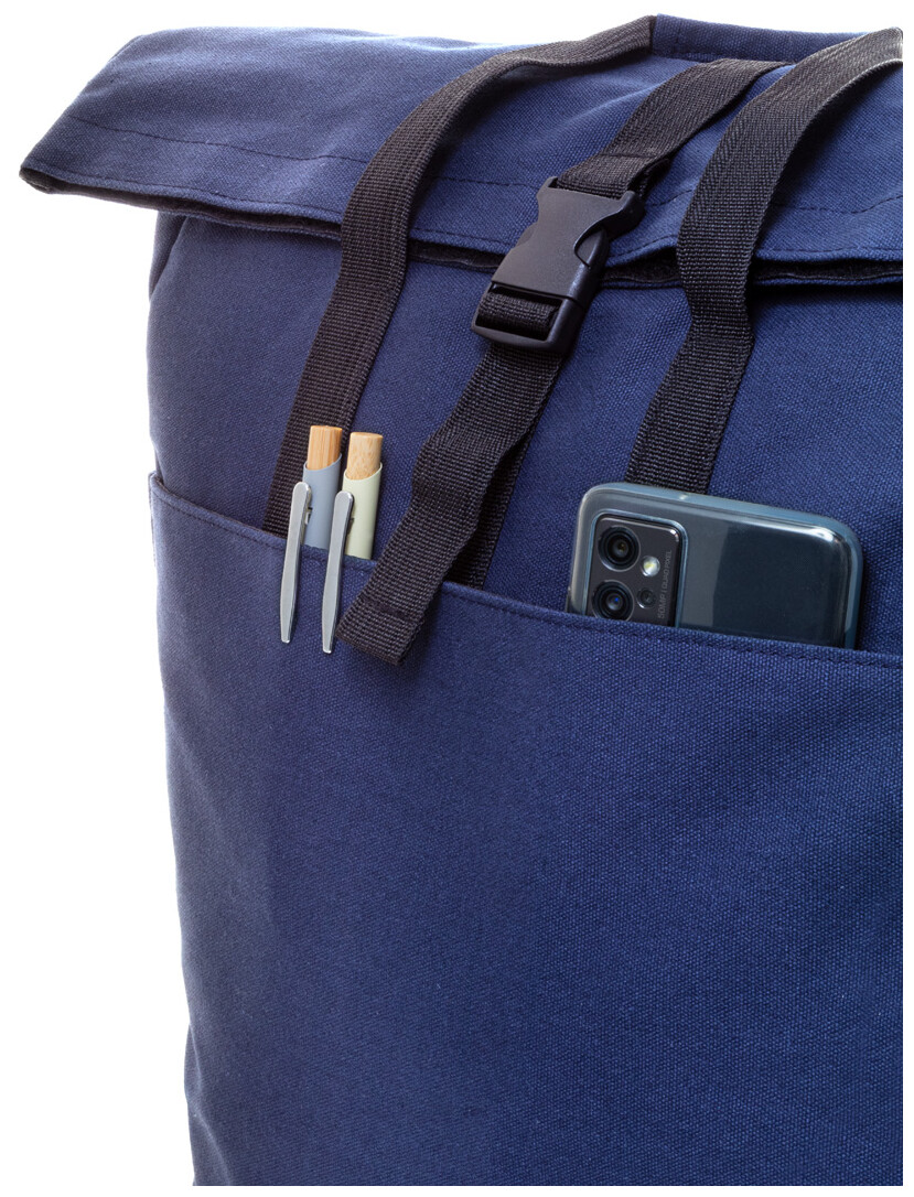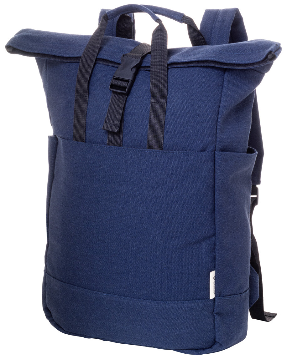 Rolovací batoh z recyklovaného plátna se zapínáním na přezku a suchý zip, polstrovaná přihrádka na notebook (15"), přední a boční kapsy. S popruhem na vozík, polstrovaná záda a ramenní popruhy. 70% recyklované bavlny a 30% RPET polyesteru. S výrazným štítkem z recyklované bavlny.