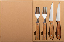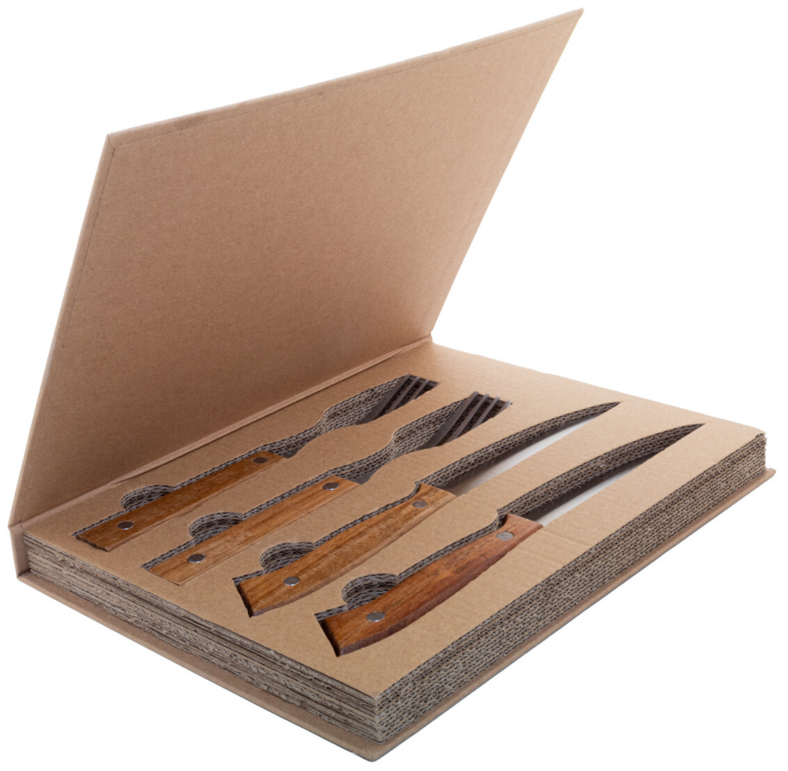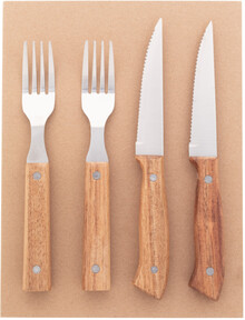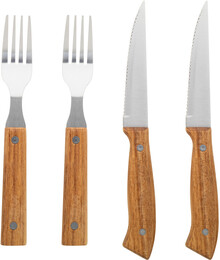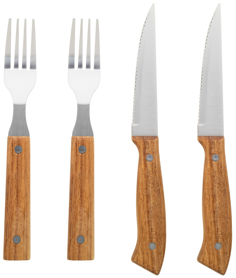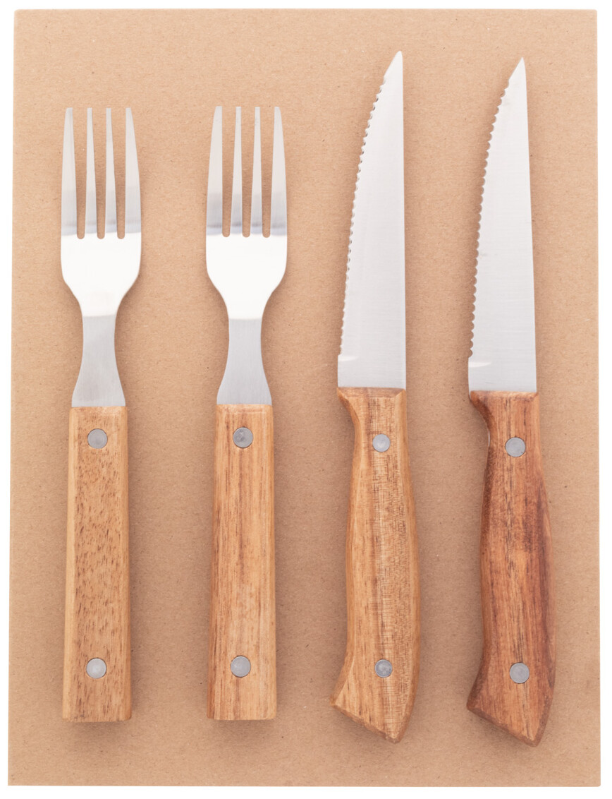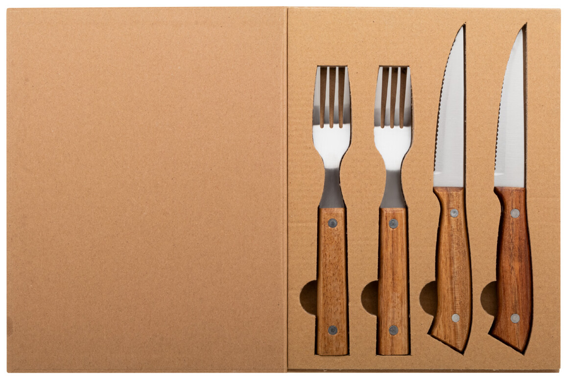 4dílná sada steakových příborů z nerezové oceli s rukojetí z akáciového dřeva (2 steakové nože, 2 vidličky). V krabičce ve tvaru knihy z kraftového papíru.