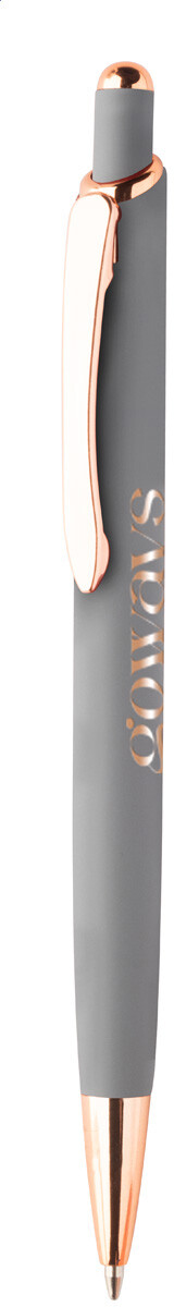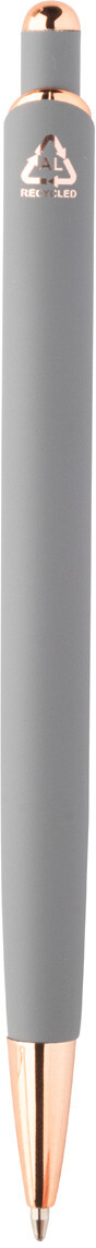 Kuličkové pero z recyklovaného hliníku s pogumovaným povrchem a detaily z růžového zlata. Se speciální povrchovou úpravou pro zrcadlové laserové gravírování v barvě růžového zlata. S modrou náplní.