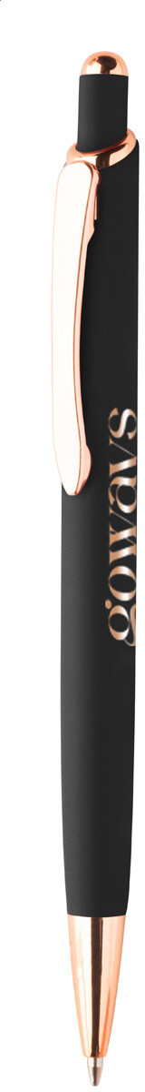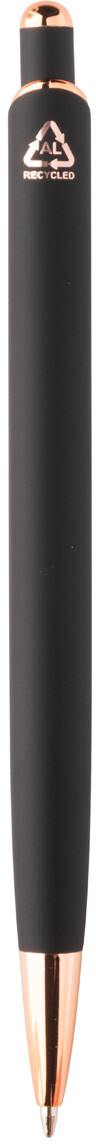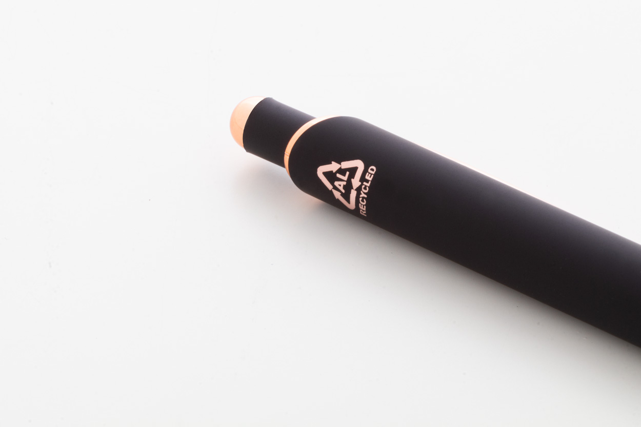 Kuličkové pero z recyklovaného hliníku s pogumovaným povrchem a detaily z růžového zlata. Se speciální povrchovou úpravou pro zrcadlové laserové gravírování v barvě růžového zlata. S modrou náplní.