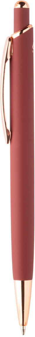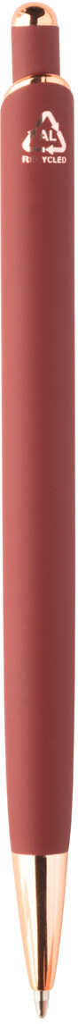 Kuličkové pero z recyklovaného hliníku s pogumovaným povrchem a detaily z růžového zlata. Se speciální povrchovou úpravou pro zrcadlové laserové gravírování v barvě růžového zlata. S modrou náplní.