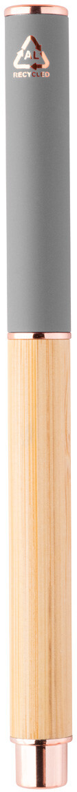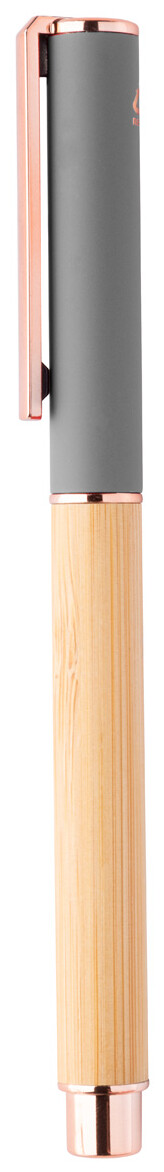 Roller pero z bambusu a recyklovaného hliníku s pogumovaným uzávěrem a detaily z růžového zlata. Se speciální povrchovou úpravou pro zrcadlové laserové gravírování v barvě růžového zlata. S modrou náplní.