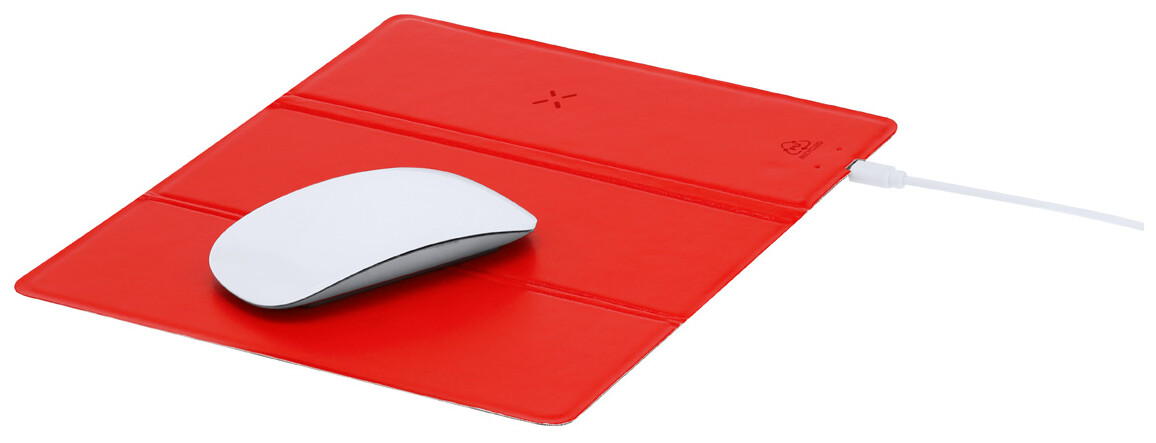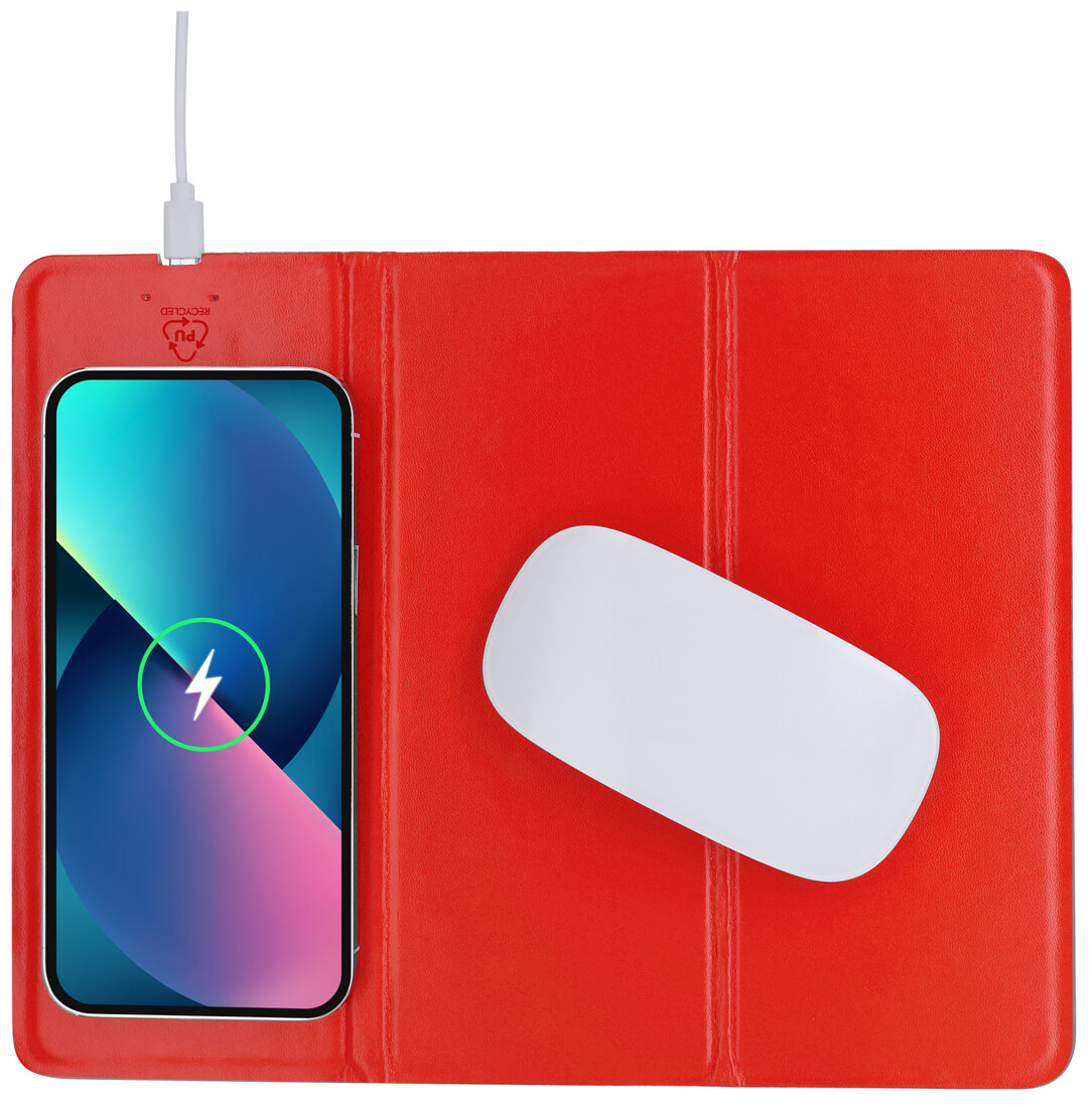 Skládací podložka pod myš z recyklované PU kůže s vestavěnou bezdrátovou nabíječkou (10W) a funkcí držáku mobilního telefonu. Se sametovou protiskluzovou základnou. Včetně USB nabíjecího kabelu.