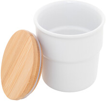 Vysoce kvalitní keramický hrnek s bambusovým víčkem. S matnou vnější a lesklou vnitřní povrchovou úpravou. 240 ml. V kraftové papírové krabici.