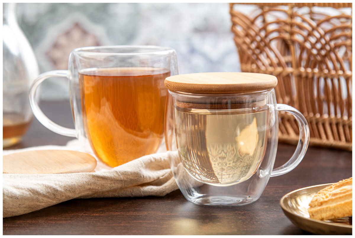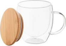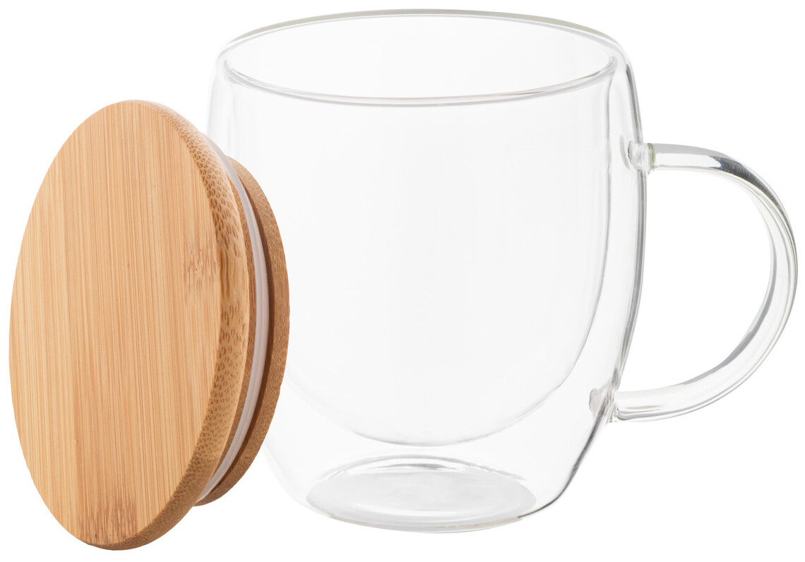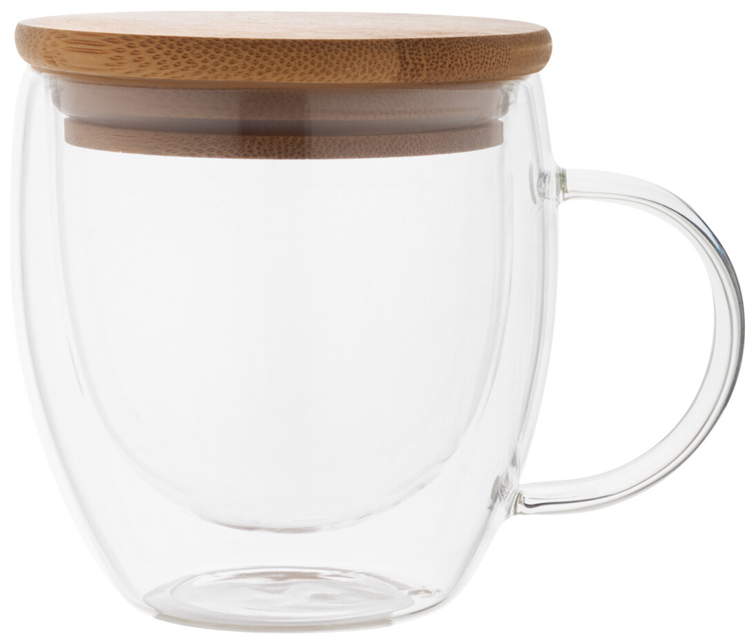 Dvoustěnný termo hrnek z borosilikátového skla s uchem a bambusovým víčkem, 250 ml. V kraftové papírové krabici.