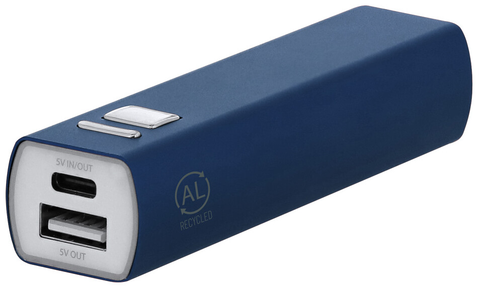 Power banka z recyklovaného hliníku s 2600 mAh baterií. S 1 portem USB a 1 portem USB-C pro nabíječku. Vstupní port USB-C. Včetně USB nabíjecího kabelu.