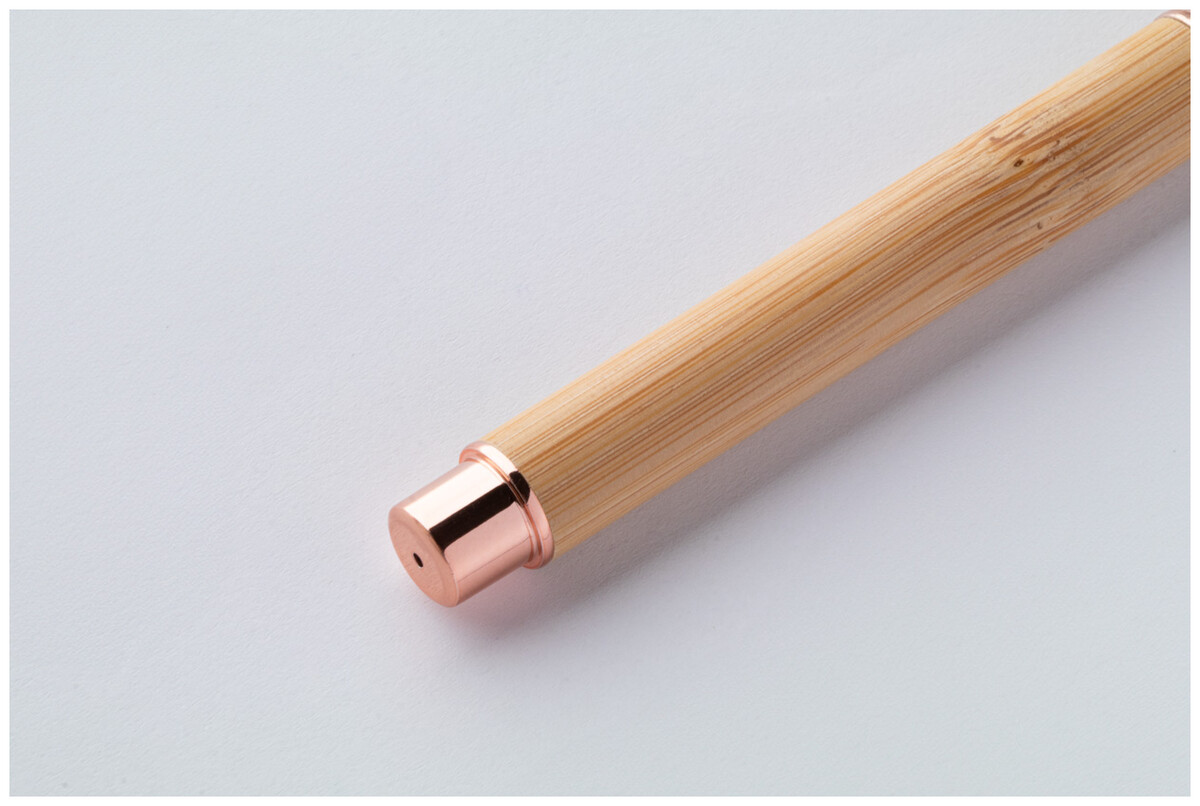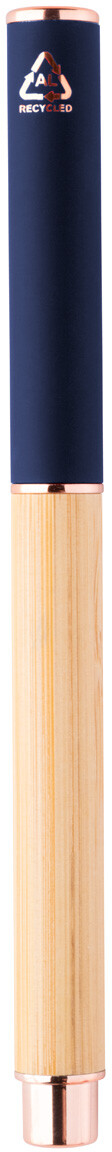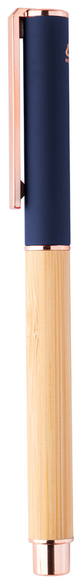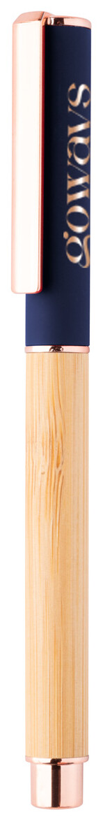 Roller pero z bambusu a recyklovaného hliníku s pogumovaným uzávěrem a detaily z růžového zlata. Se speciální povrchovou úpravou pro zrcadlové laserové gravírování v barvě růžového zlata. S modrou náplní.