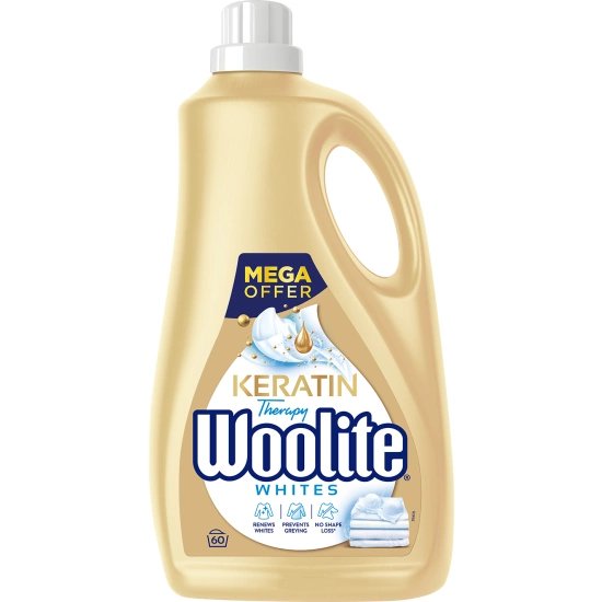 Woolite Keratin Therapy Whites je vysoce účinný tekutý prací gel na bílé prádlo, který nejenom účinně čistí, ale také chrání barvy na oblečení před vyblednutím. Díky obsahu keratinu pomáhá chránit textilní vlákna, dodává jim jemnost, chrání před žmolkováním a látku nemačká.