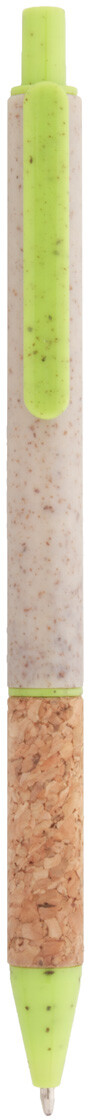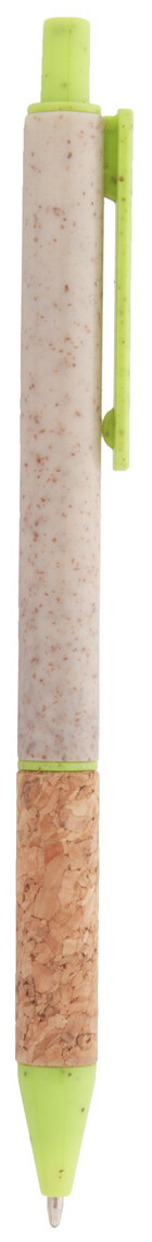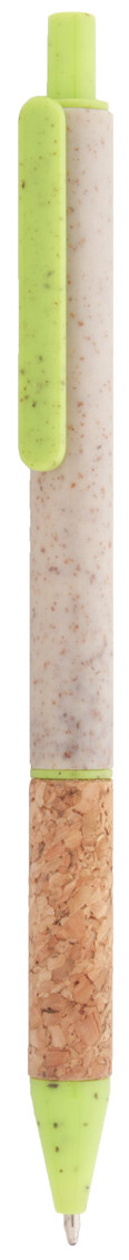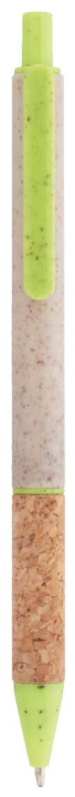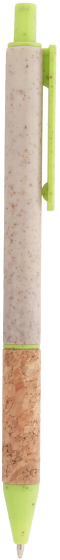 Ekologické plastové kuličkové pero z pšeničné slámy s přírodním korkem a barevnými částmi. S modrou náplní.