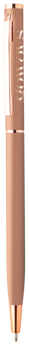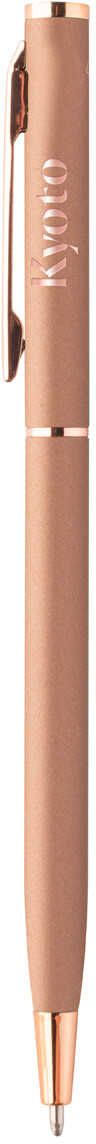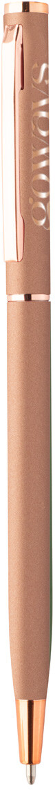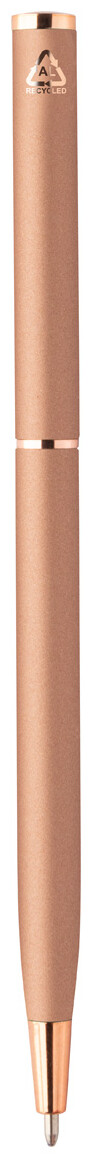 Kuličkové pero z recyklovaného hliníku s pogumovaným povrchem a detaily z růžového zlata. Se speciální povrchovou úpravou pro zrcadlové laserové gravírování v barvě růžového zlata. S modrou náplní.