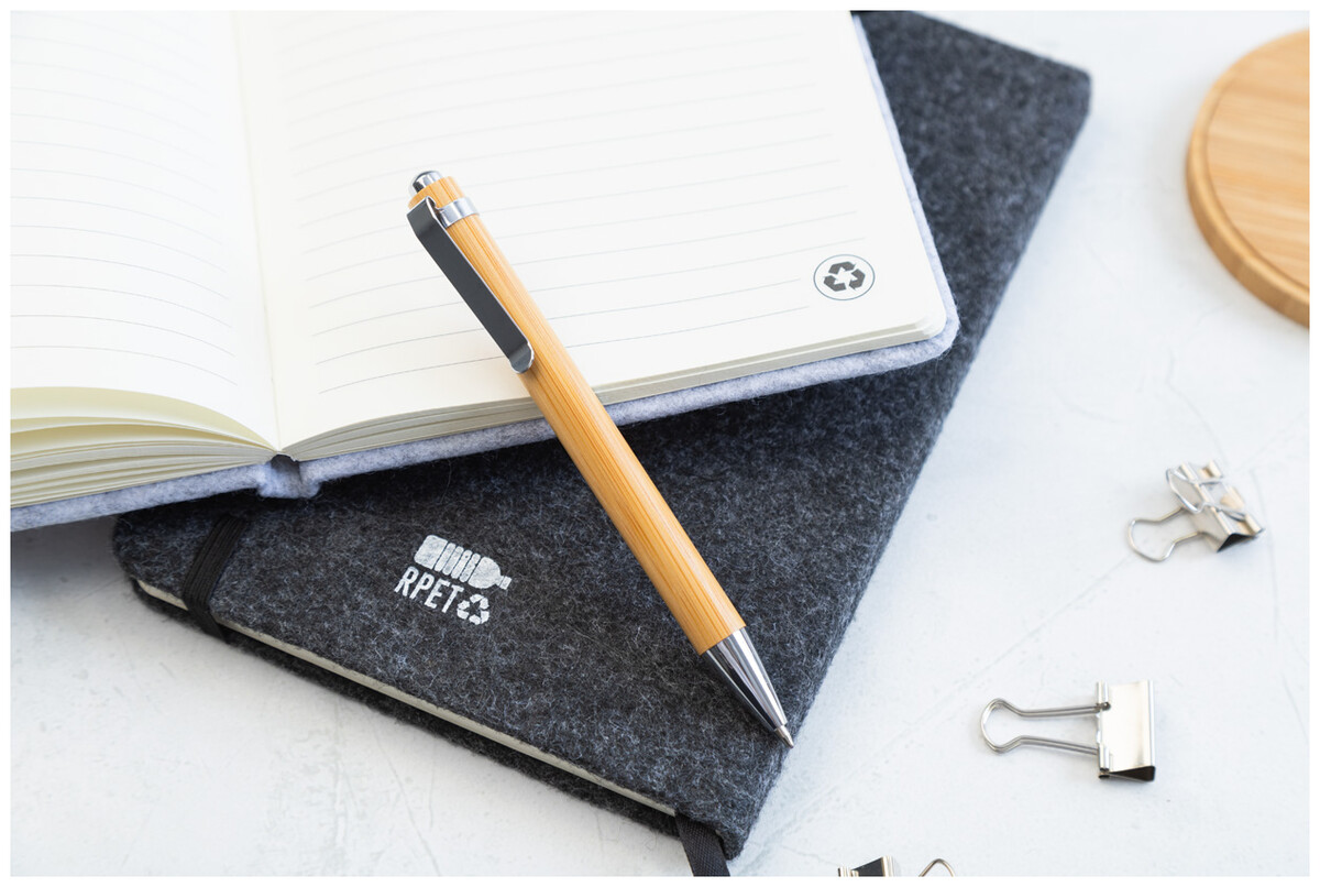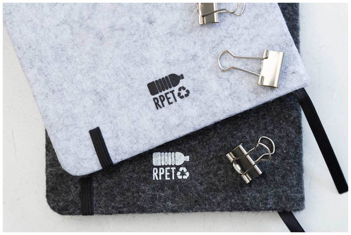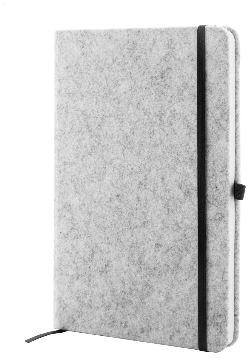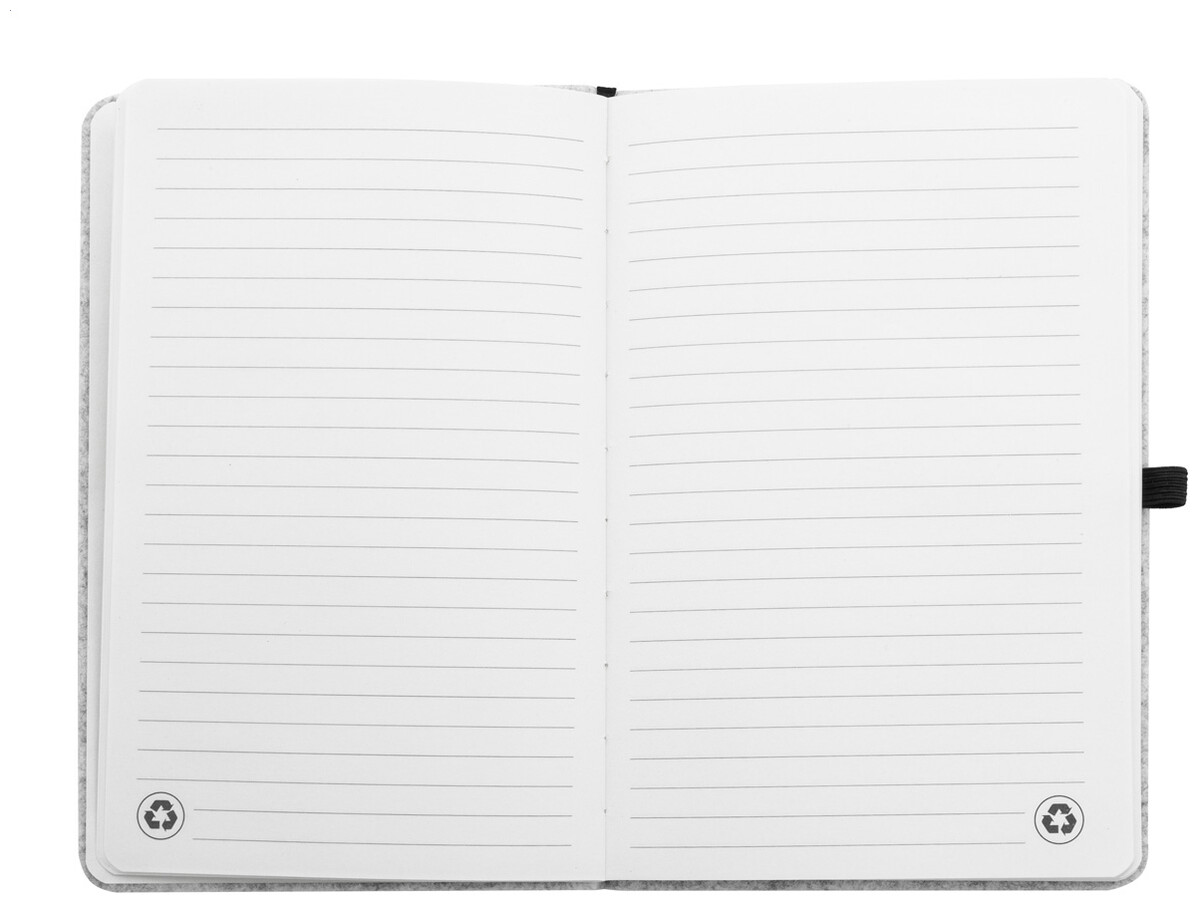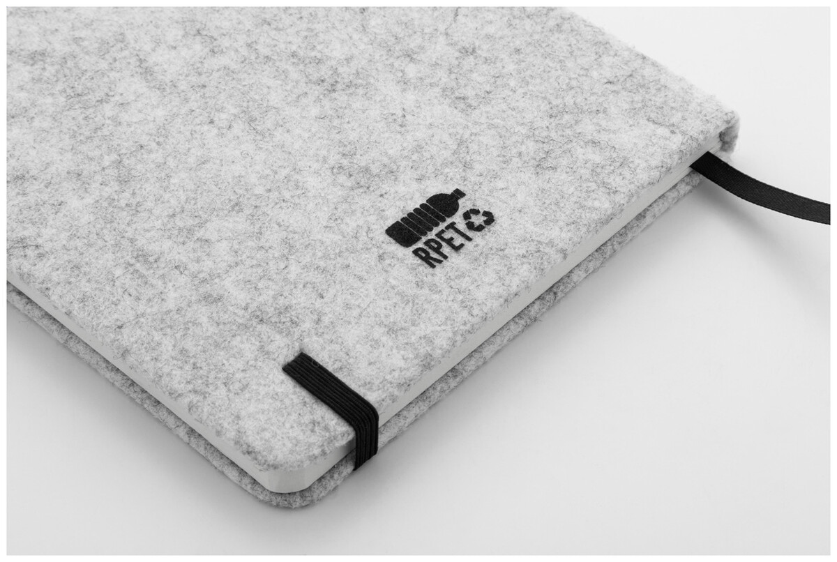 Blok A5 potažený plstí RPET s 80 linkovanými listy z recyklovaného papíru. Se záložkou, gumovým páskem a držákem na pero.