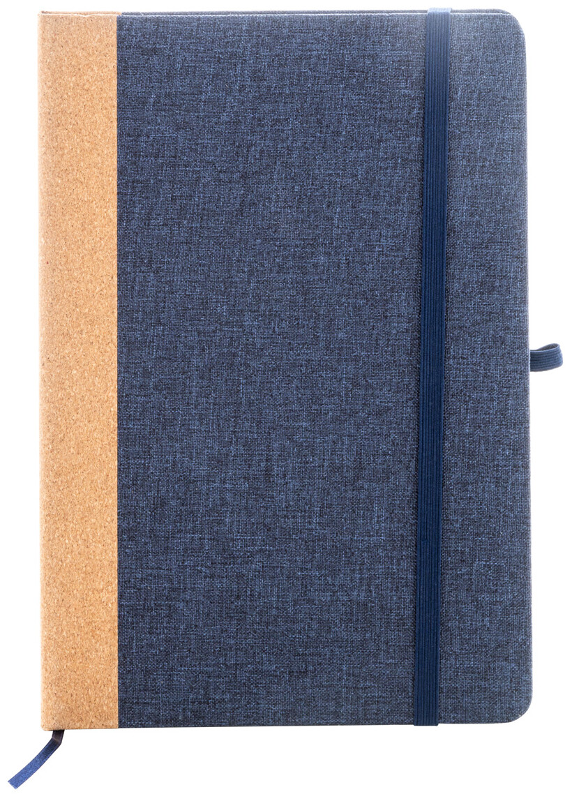 Blok A5 potažený polyesterem RPET s hřbetem z přírodního korku a 80 linkovanými listy z recyklovaného papíru. Se záložkou, gumovým páskem a držákem na pero.