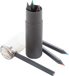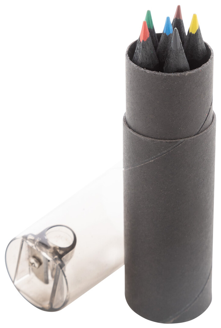 6dílná sada pastelek z černého dřeva v kulatém černém pouzdře z kartonu s plastovým ořezávátkem.