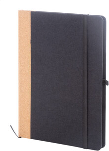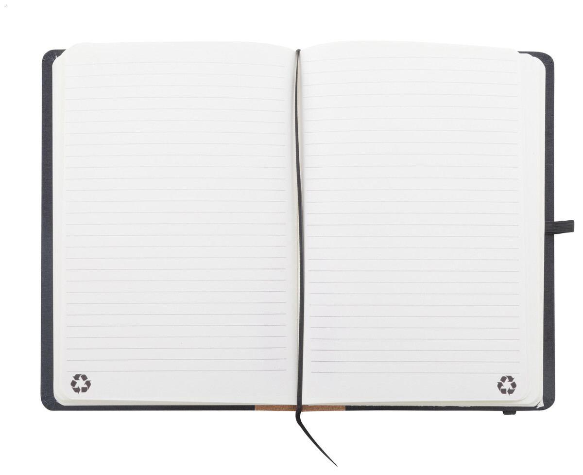 Blok A5 potažený polyesterem RPET s hřbetem z přírodního korku a 80 linkovanými listy z recyklovaného papíru. Se záložkou, gumovým páskem a držákem na pero.