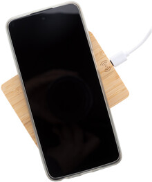 Bezdrátová rychlonabíječka (10W) v bambusovém pouzdře ve tvaru palety. Včetně USB nabíjecího kabelu.
