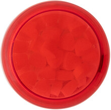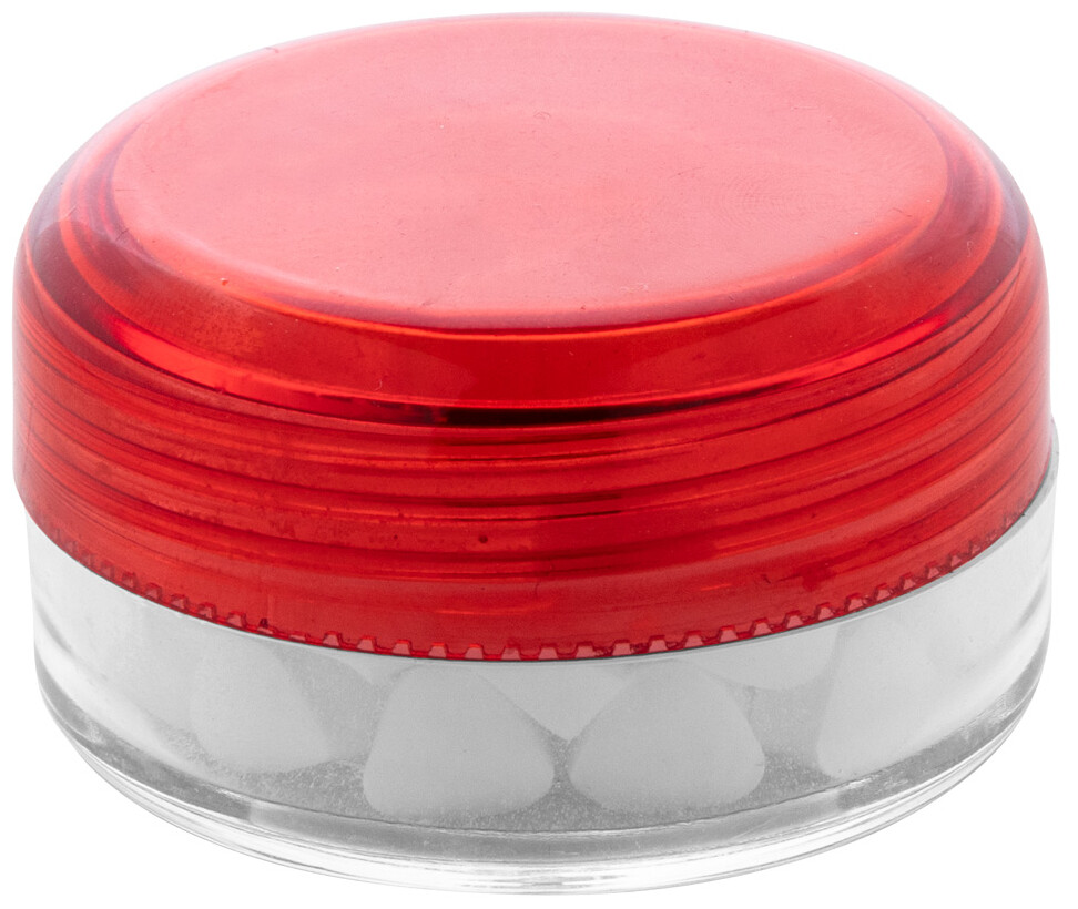 Kulatá průhledná plastová dóza s mintovými bonbóny s barevným šroubovacím víčkem. Obsahující cca. 12 gramů mentolových bonbonů bez cukru.