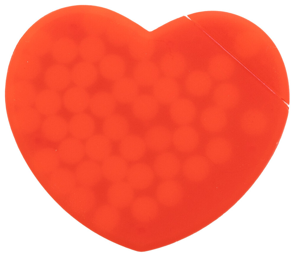 Plastový dávkovač mintových bonbónů ve tvaru srdce s cca. 8 gramů mentolových bonbonů bez cukru.