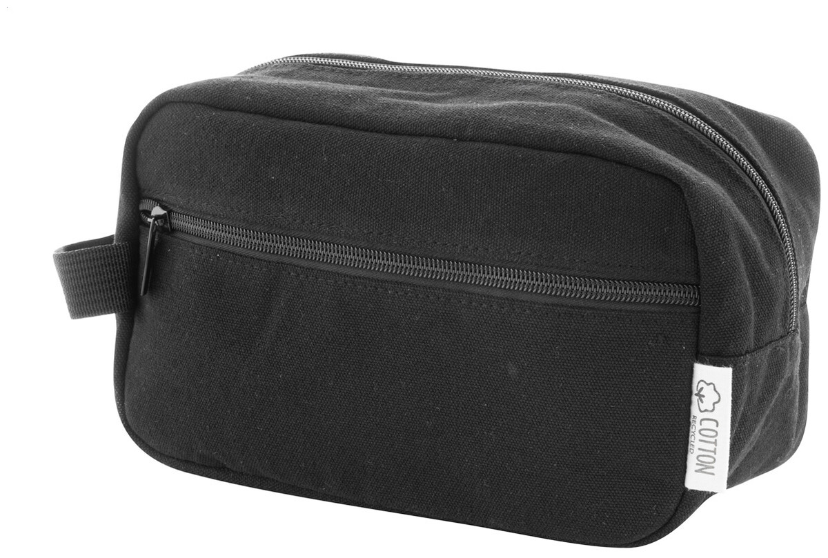 Kosmetická taštička z recyklovaného plátna se dvěma přihrádkami na zip a rukojetí. 70% recyklovaná bavlna a 30% RPET polyester. S výrazným štítkem z recyklované bavlny.