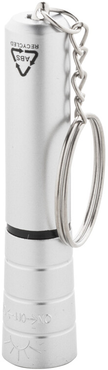 Mini baterka s 1 LED, z recyklovaného ABS plastu s kovovým povrchem a kovovým kroužkem na klíče. S knoflíkovou baterií.
