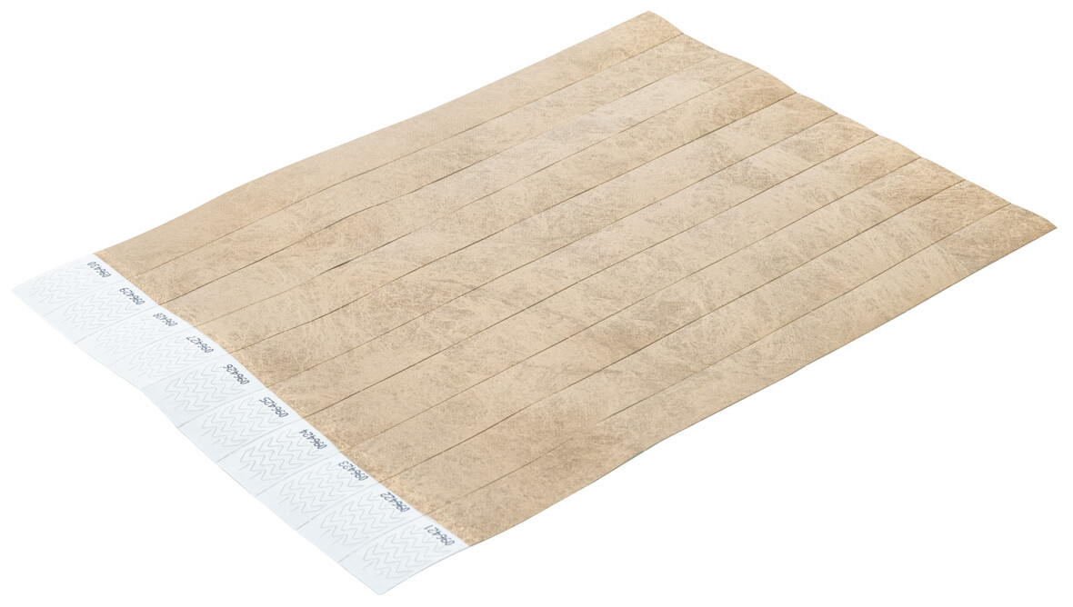 Jeden arch 19 mm širokých tyvekových náramků (10 ks) s lepicím bezpečnostním uzávěrem a jedinečným číslováním.