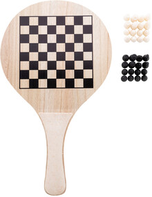 Plážový tenisový set ze dřeva a ekologického plastu z pšeničné slámy se 2 raketami a jedním míčkem. Včetně 3 deskových her, které lze hrát na raketách. V bavlněném pytlíku se stahovací šňůrkou.