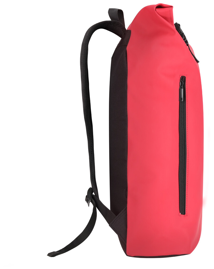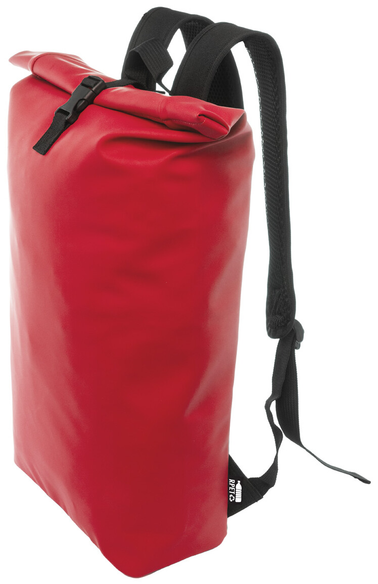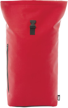 Vodotěsný, měkký rolovací batoh z recyklované PU kůže se zapínáním na přezku, přední kapsou na zip a polstrovanou přihrádkou na notebook (15"). S polstrovanými zády a ramenními popruhy. S výrazným recyklovaným PU štítkem.