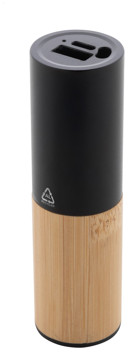 Power banka z recyklovaného hliníku a bambusu s baterií 2600 mAh. S 1 portem USB a 1 portem USB-C pro nabíječku. Vstupní port USB-C. Včetně USB nabíjecího kabelu.